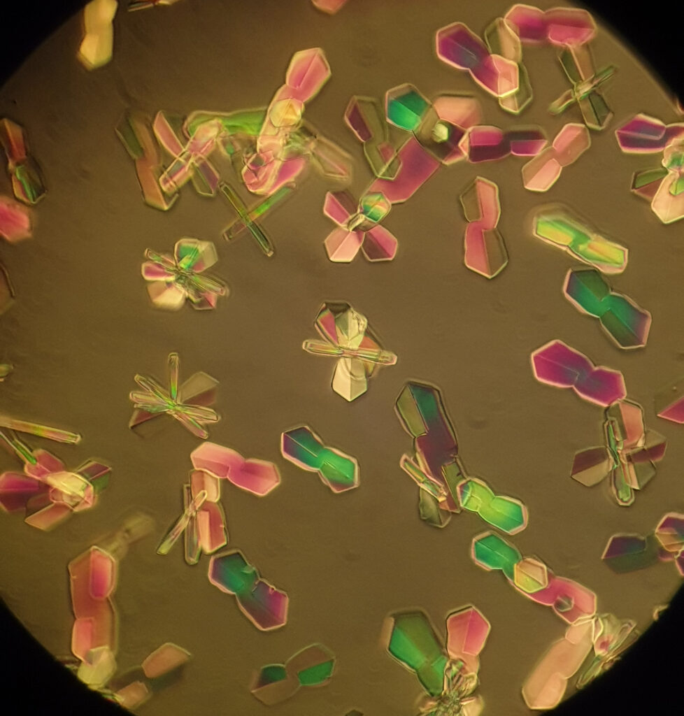 Na wat langer indampen en regelmatig wat alcohol toevoegen kon ik een preparaat maken waar mooie kristallen op aanwezig waren. Dit lijken inderdaad koper-eryhritol kristallen te zijn. Onderstaande foto is gemaakt met een polarisatiefilter. Onder wit licht laten de kristallen echter een flauwgroene kleur zien die wijst op de aanwezigheid van koper. Volgens de literatuur hebben de Cu(II)erythritol kristallen een trikliene structuur.