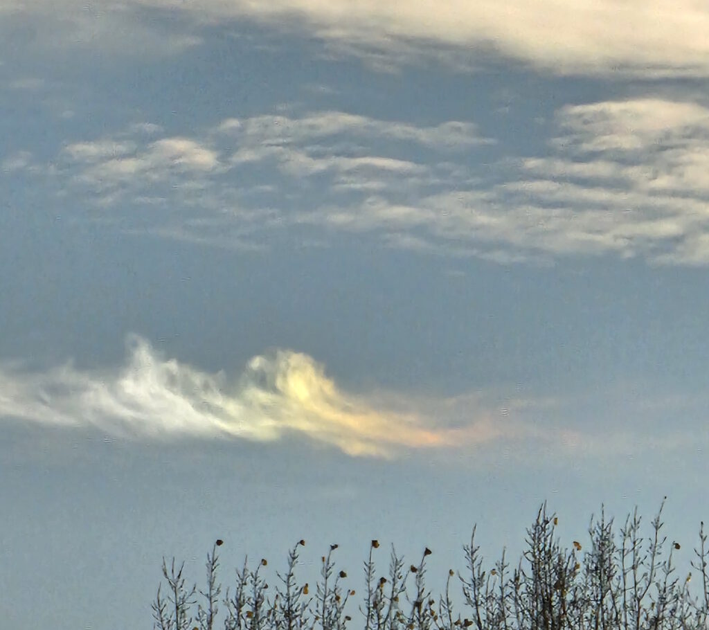 Afgelopen week viel mij al fietsende vanuit Amsterdam op de Hoofdweg naast Schiphol een merkwaardig gekleurde wolk in de lucht op. Het leek wel of een heel spectrum op de wolk geprojecteerd werd. Stoppen en mijn smartphone pakken om een foto te maken kost wat tijd dus de kleuren op onderstaande foto zijn wat vager en minder kleurrijk dan ik meende waar te nemen, hetgeen lijkt te bevestigen dat het inderdaad om een projectie van een lichtspectrum op de wolken gaat. Men kan zien dat de kleuren meer pastelvormig zijn.