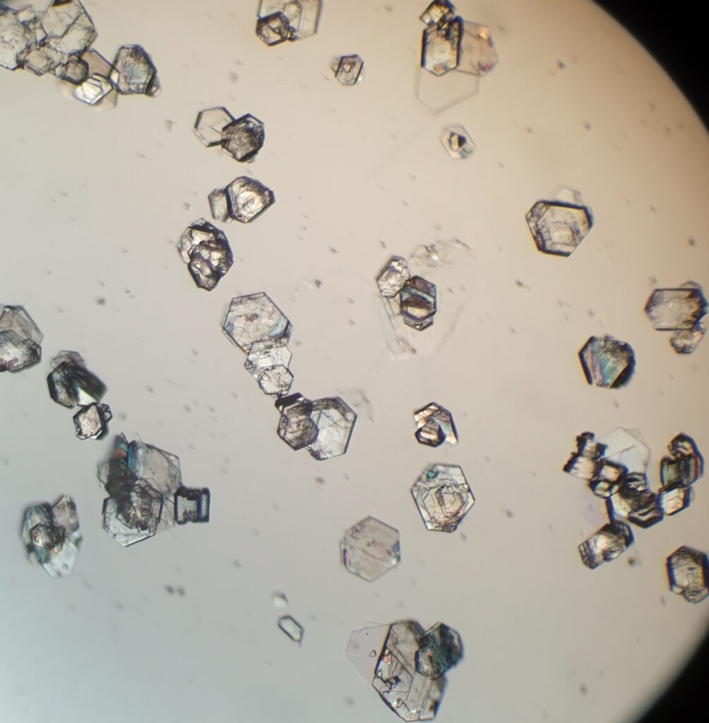 Aan 200 µl 3% boorwater (H3BO3) is 10 µl fosforzuur 8% (H3PO4) toegevoegd en vervolgens ingedampt op een objectglaasje. Boorzuur kristallen hebben een trikliene kristalstructuur.