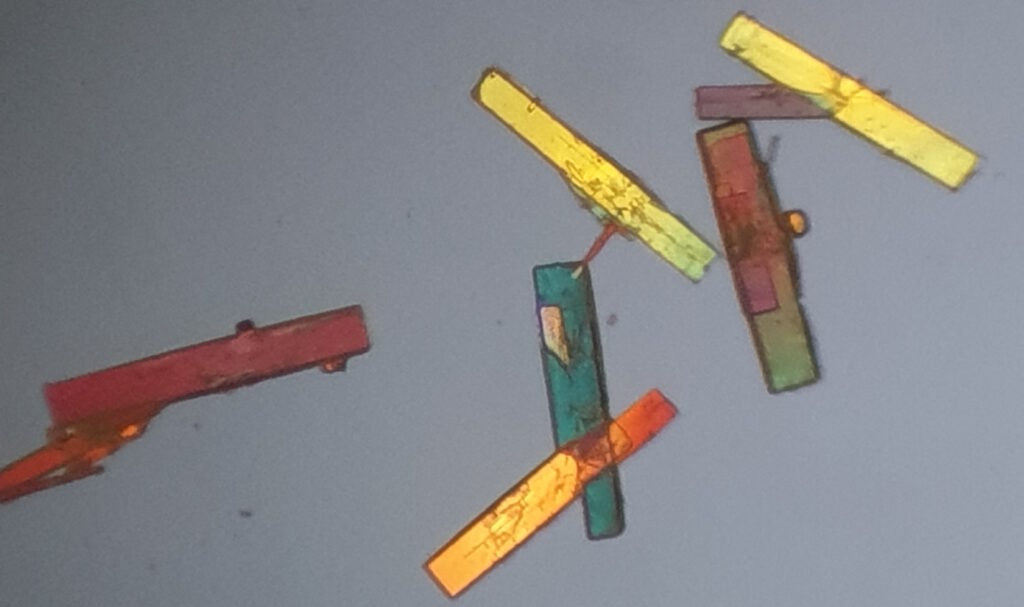 Bismutnitraat (Bi(NO3)2) kristallen gemaakt door het oplossen van bismut in geconcentreerd saltpeterzuur (HNO3) en vervolgens de oplossing in te dampen.